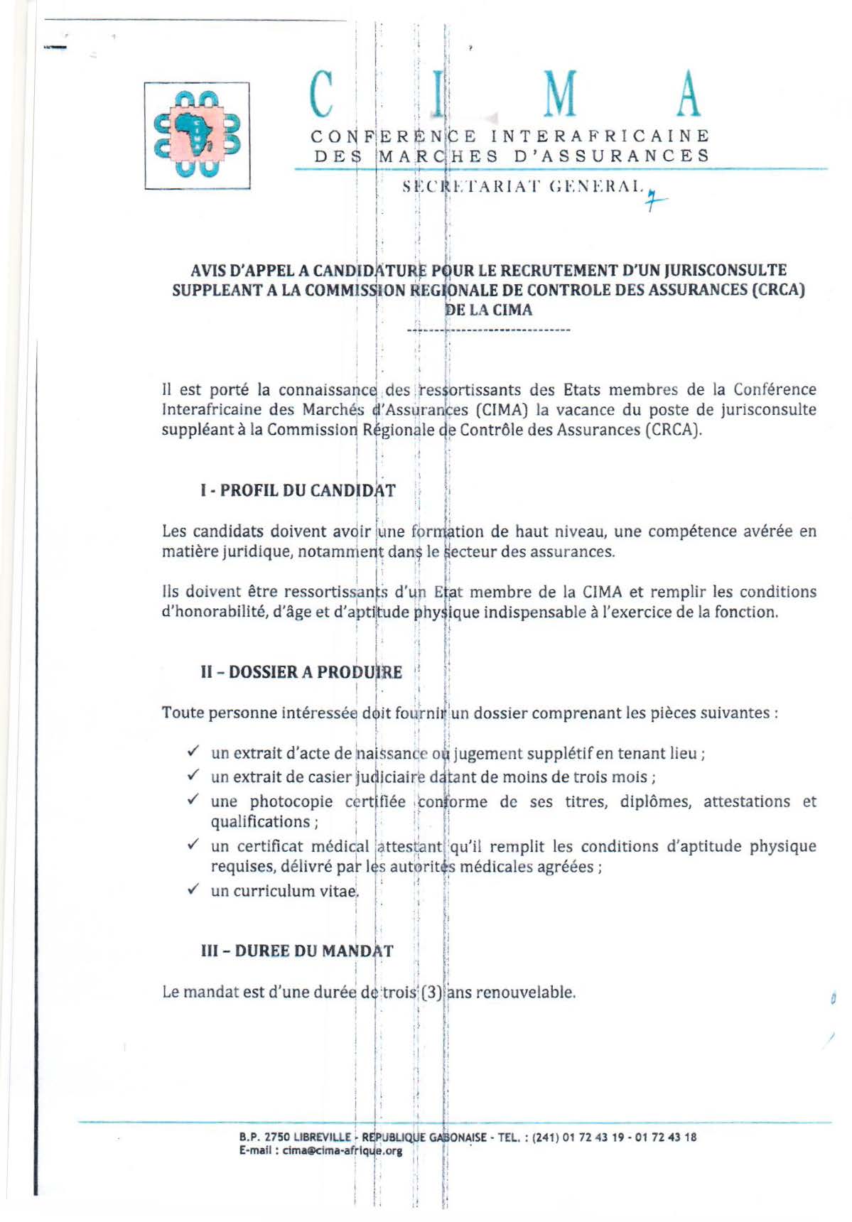 > Avis d'appel à candidatures pour le recrutement d'un jurisconsulte suppléant, à la Commission Régionale du Contrôle des Assurances (CRCA) de la CIMA