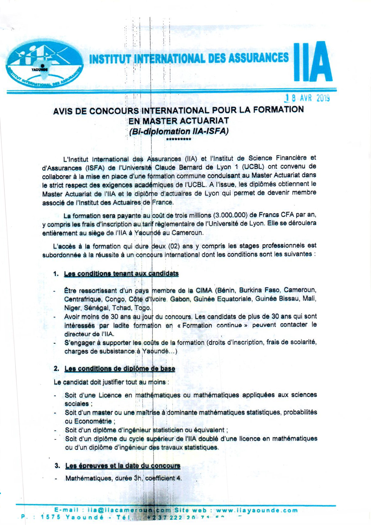 > Avis de concours international pour la formation en master actuariat (Bi-diplomation IIA-ISFA)