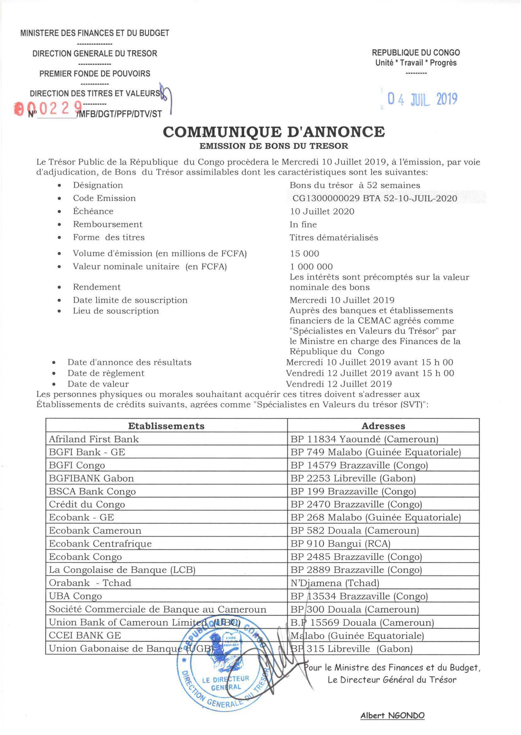 Communiqué d'annonce - émission des bons de Trésor du 10 juillet 2019