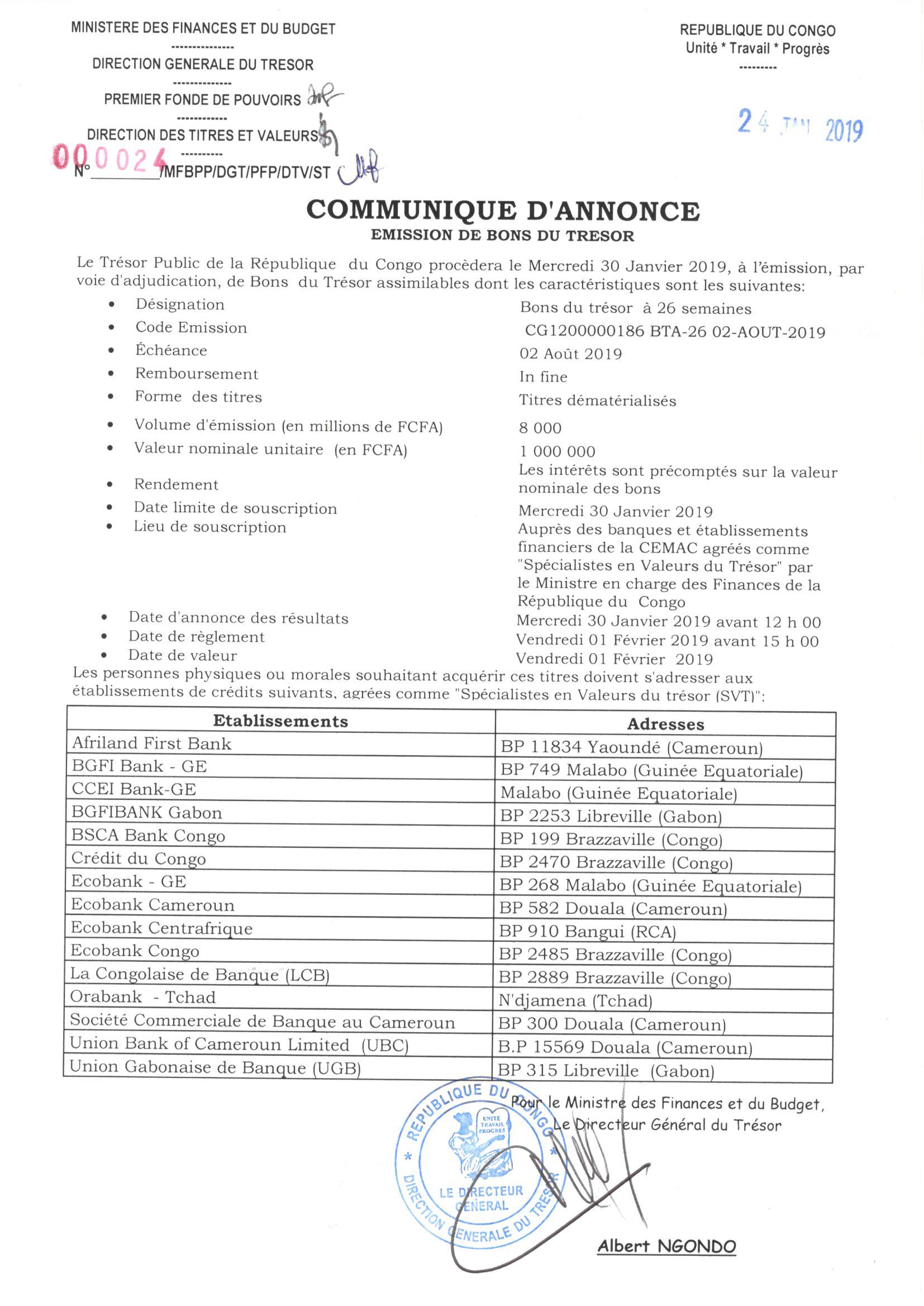 Communiqué d'annonce - émissions des bons de Trésor du 30 Janvier 2019