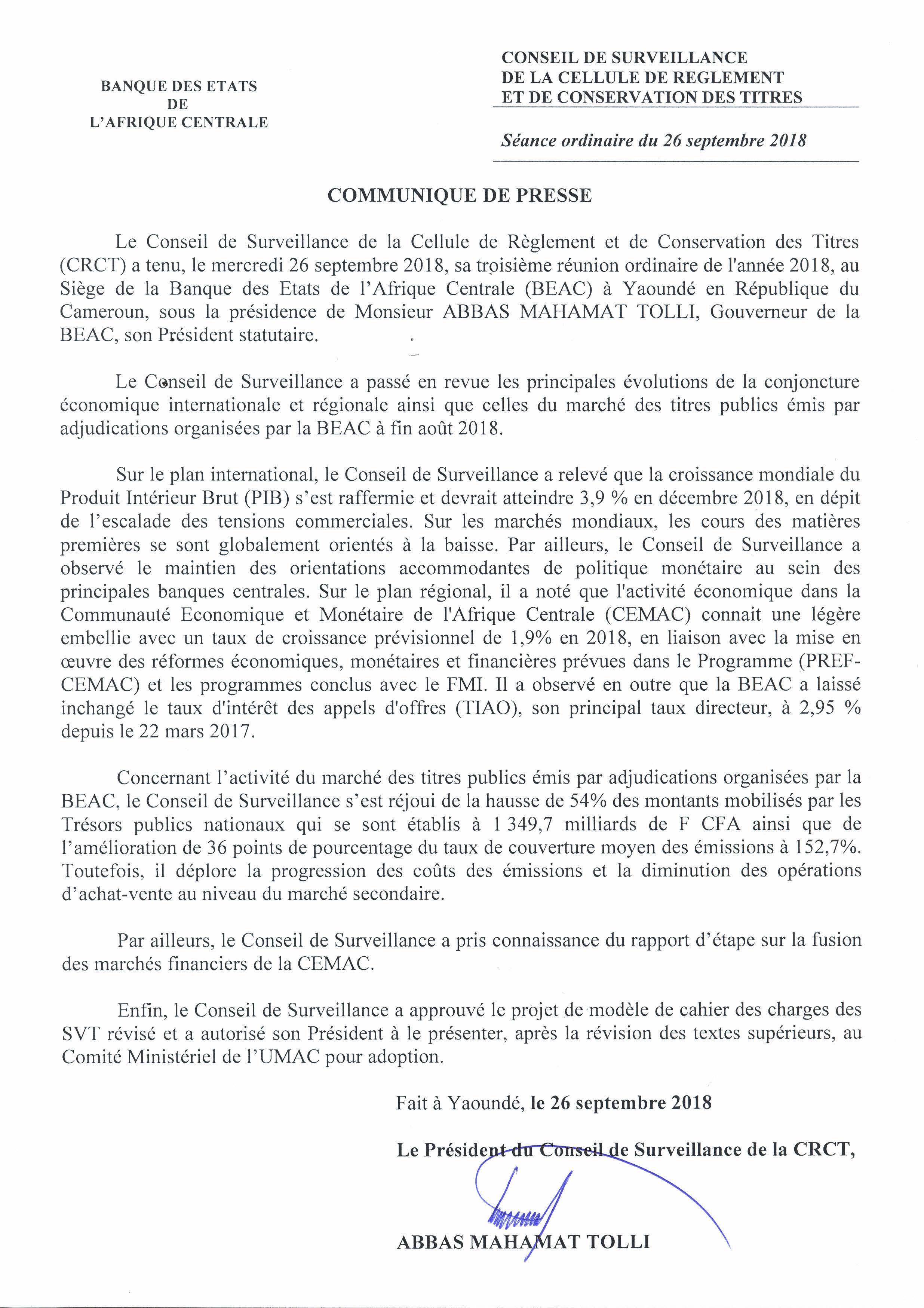 Communiqué de presse du Conseil de Surveillance de la Cellule de Règlement et de Conservation des Titres (CRCT) - 26 Septembre 2018