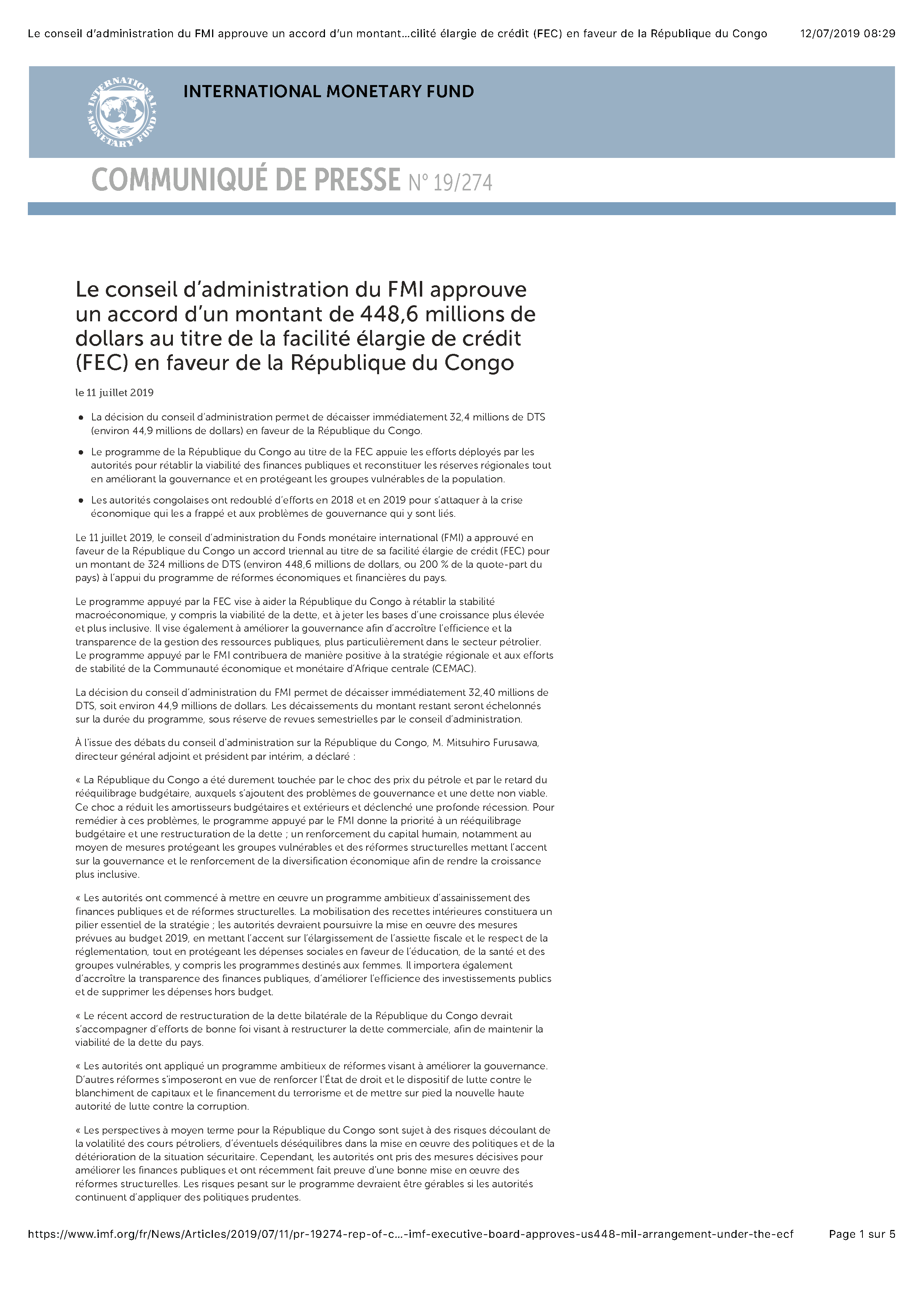 Communiqué de presse du Fonds Monétaire International, à l'issue du Conseil d'administration du 11 juillet 2019
