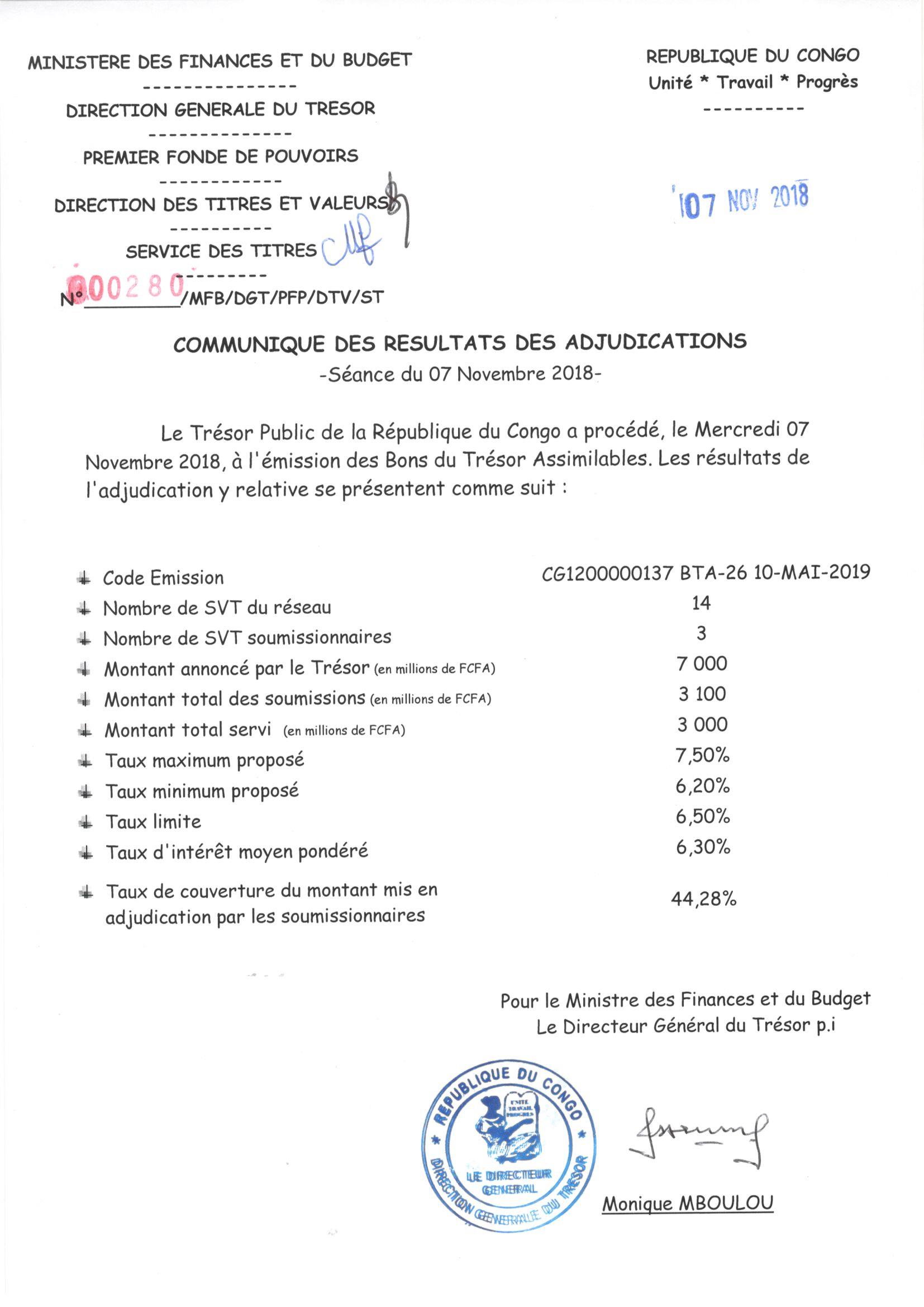 > Communiqué des résultats d'adjudication des Bons de Trésor Assimilables de la République du Congo : séance du 07 Novembre 2018