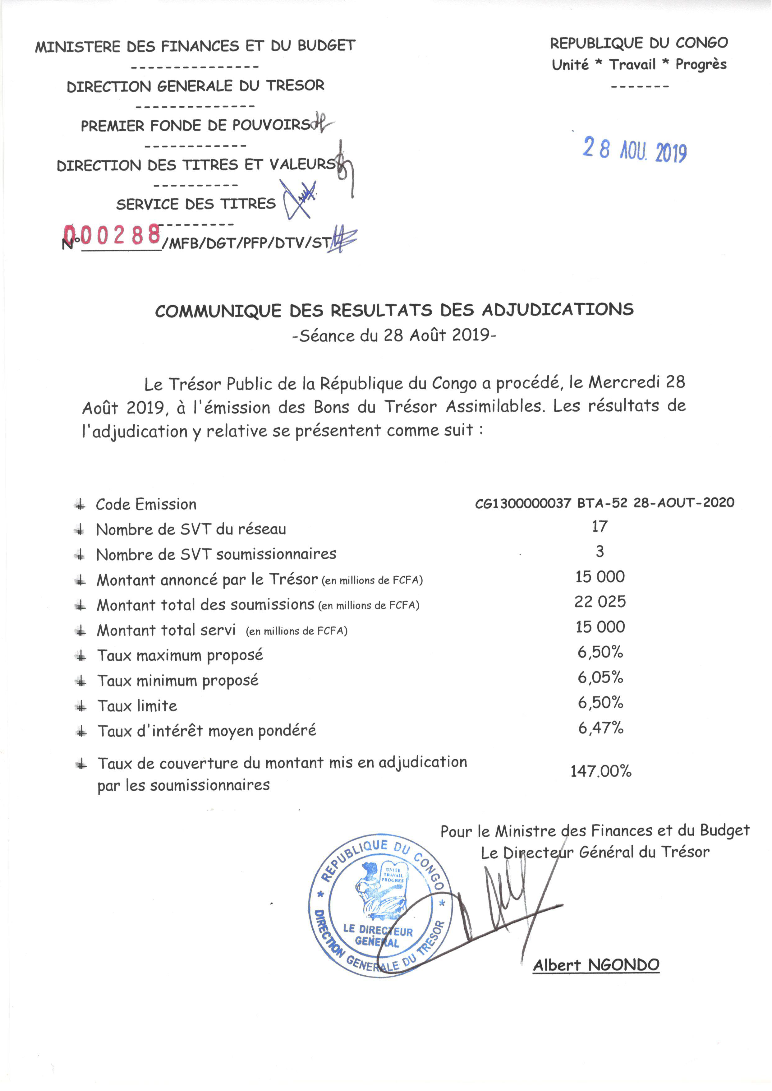 Communiqué des résultats d'adjudication des Bons de Trésor Assimilables de la République du Congo : séance du 28 Août 2019