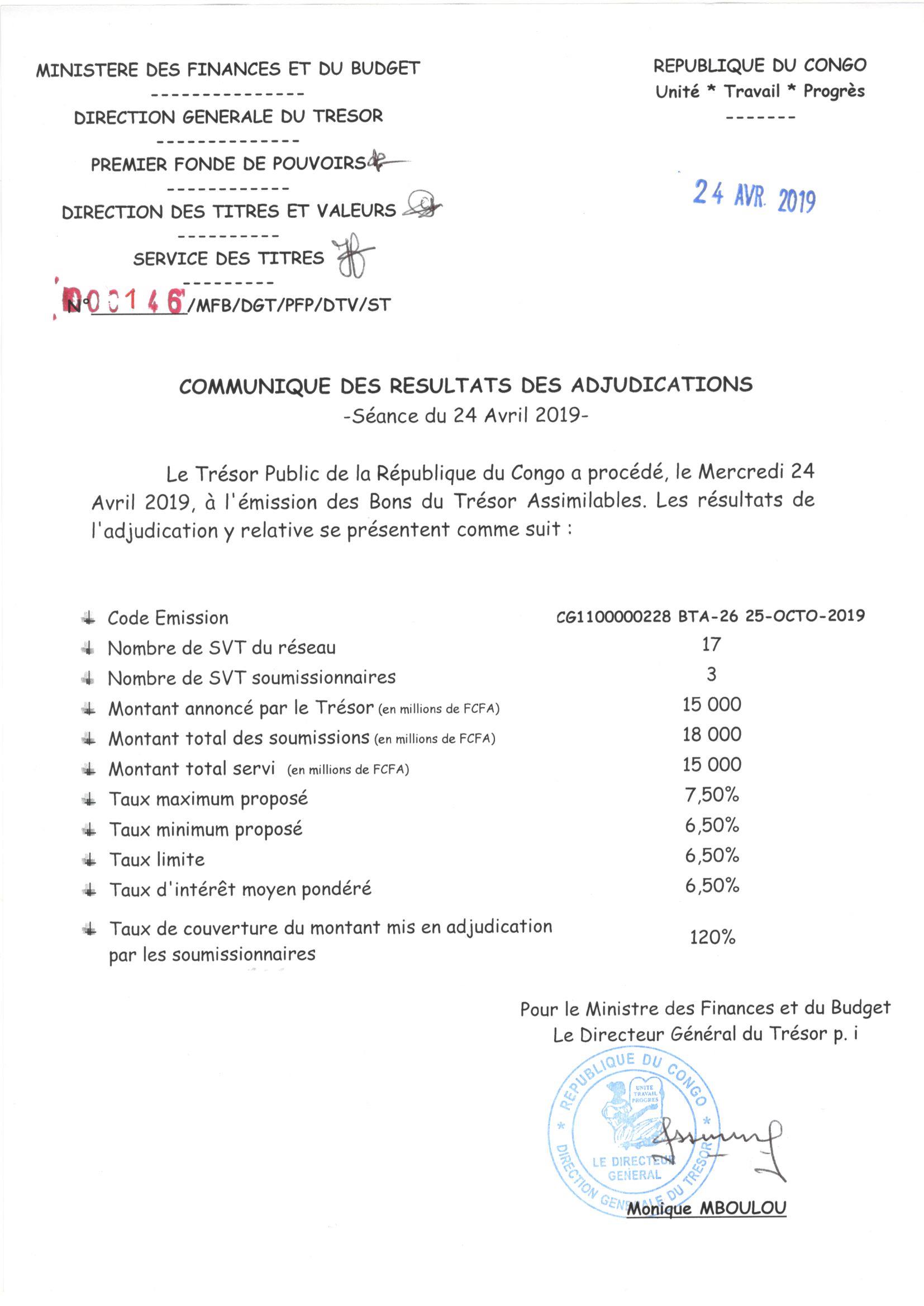 Communiqué des résultats d'adjudication des Bons de Trésor Assimilables de la République du Congo : séance du 24 Avril 2019