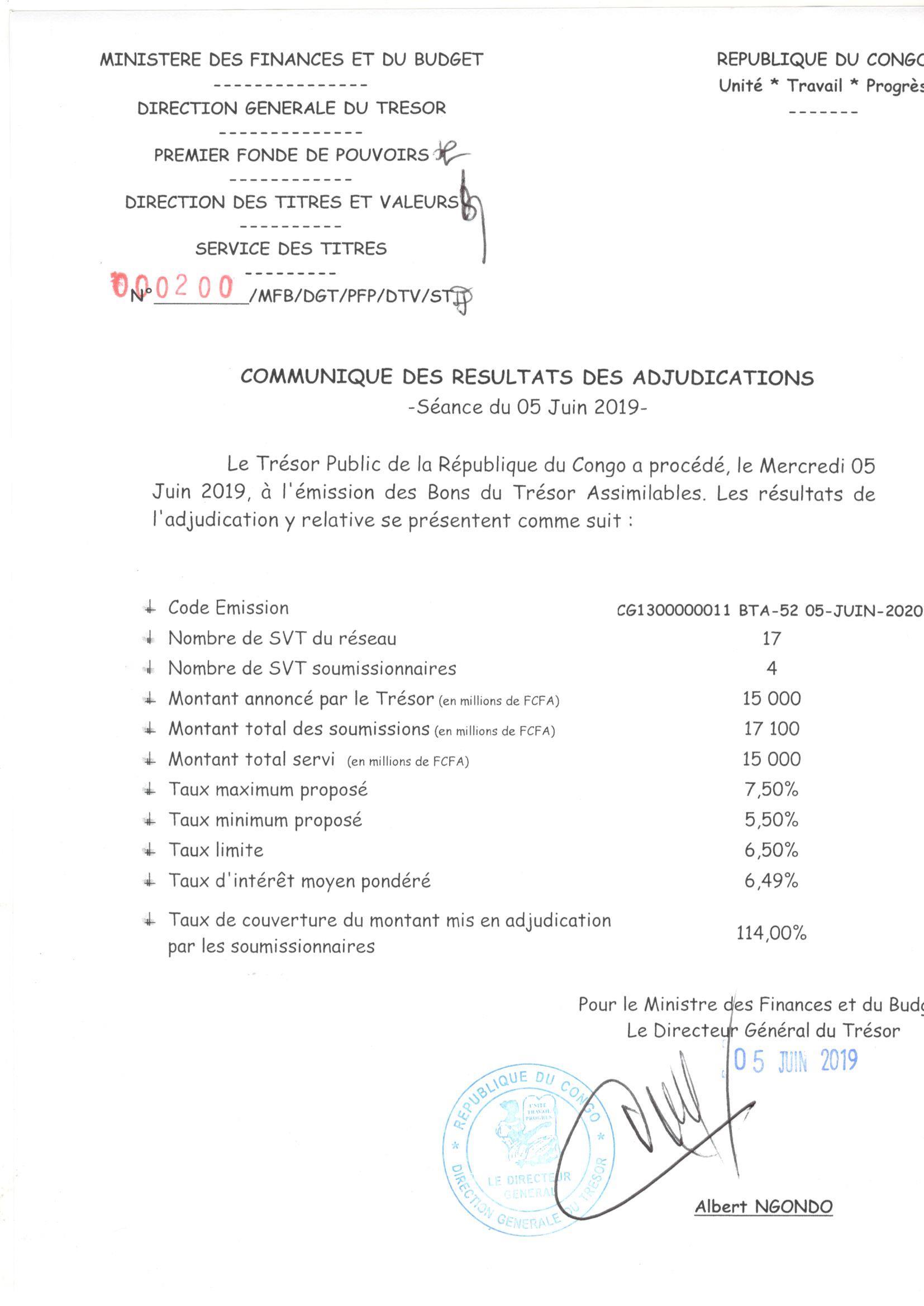 Communiqué des résultats d'adjudication des Bons de Trésor Assimilables de la République du Congo : séance du 5 juin 2019