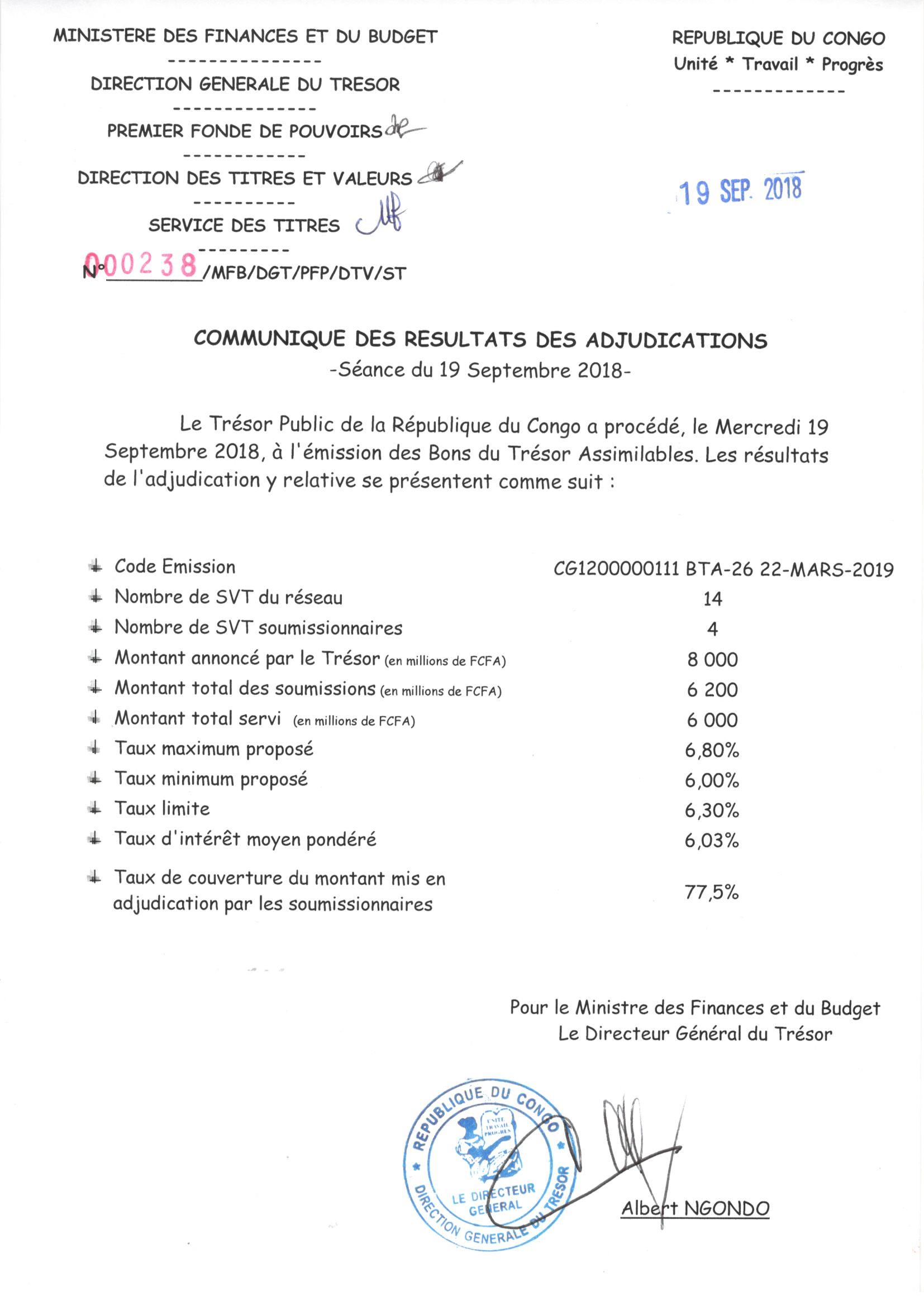 Communiqué des résultats d'adjudication des Bons du Trésor Assimilables de la République du Congo : séance du 19 Septembre 2018