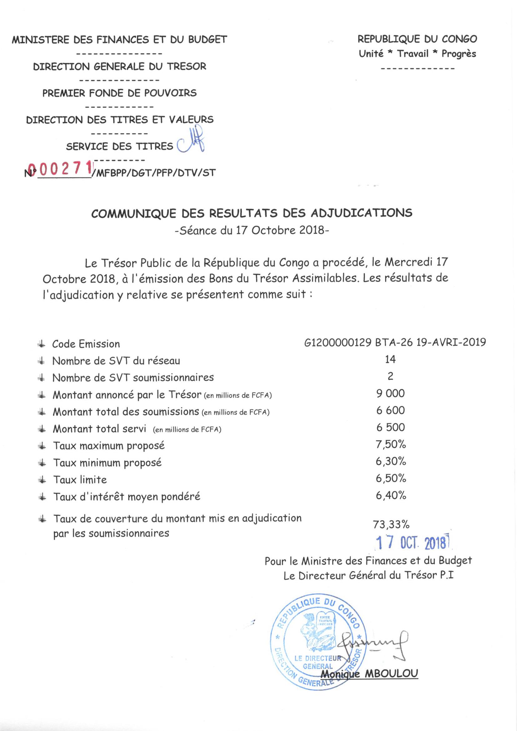 Communiqué des résultats d'adjudication des Bons du Trésor Assimilables de la République du Congo : séance du 17 Octobre 2018