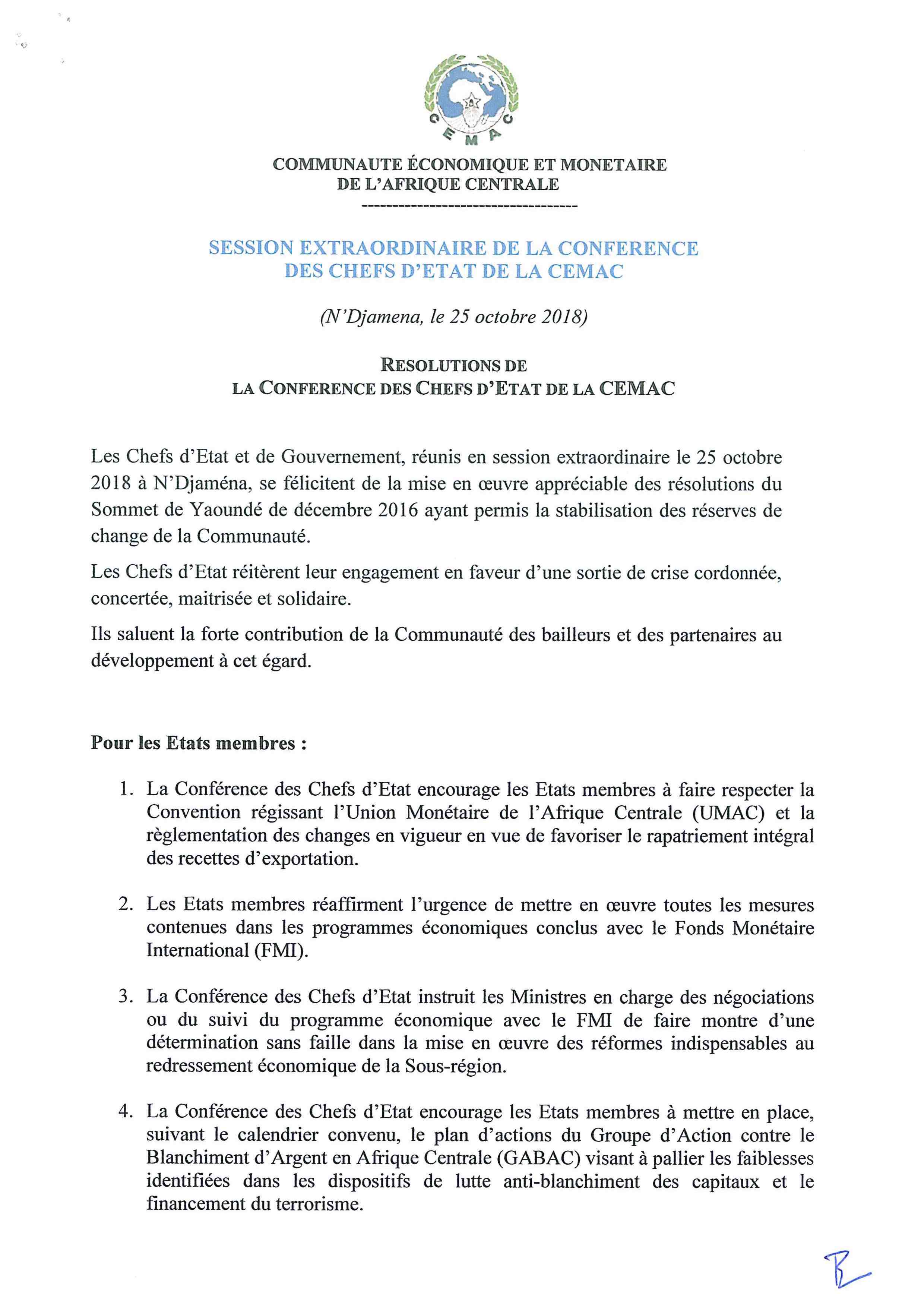 > Communiqué final de la session extraordinaire de la Conférence des Chefs d'Etat de la CEMAC - 25 Octobre 2018