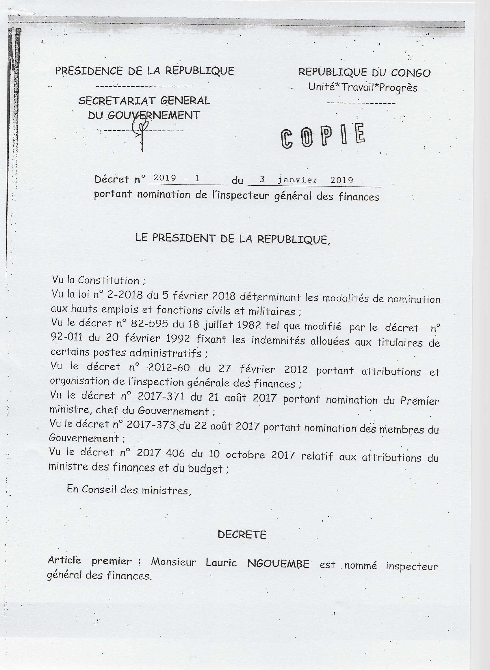 > Décret N° 2019-1 portant nomination de l'inspecteur général des finances