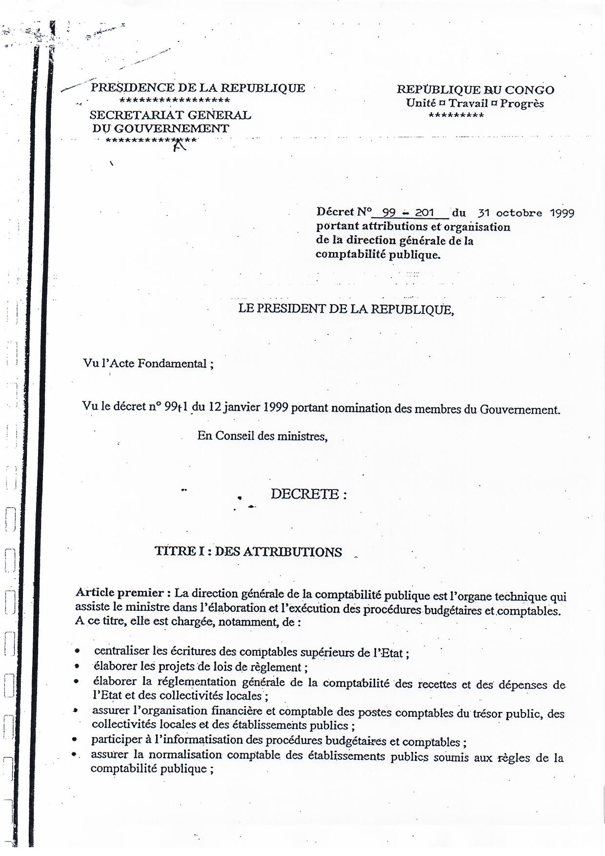 > Décret N° 99-201 portant attributions et organisation de la direction générale de la comptabilité publique