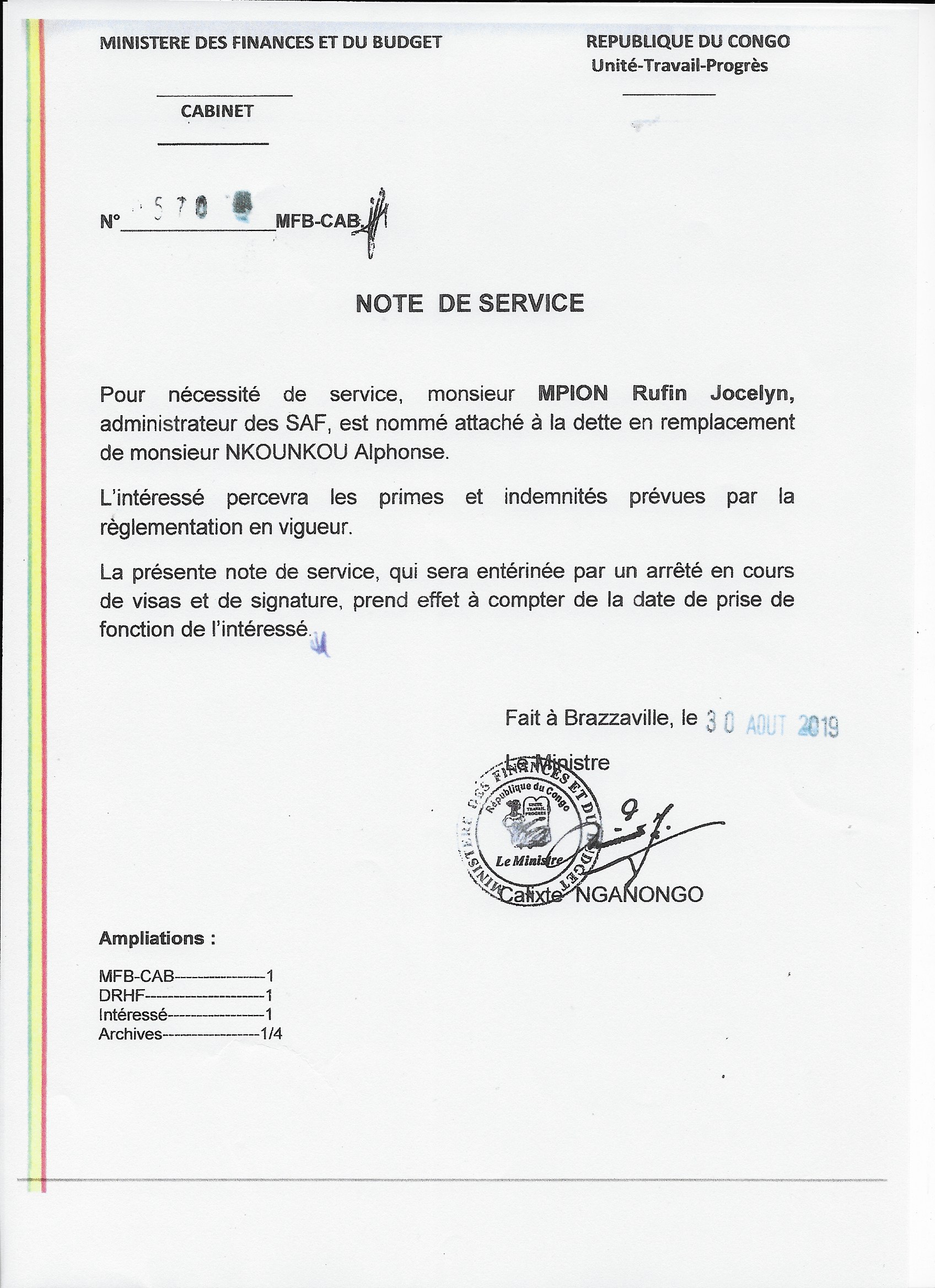 > Note de service n°0570/MFB-CAB relative à la nomination de l'attaché à la dette