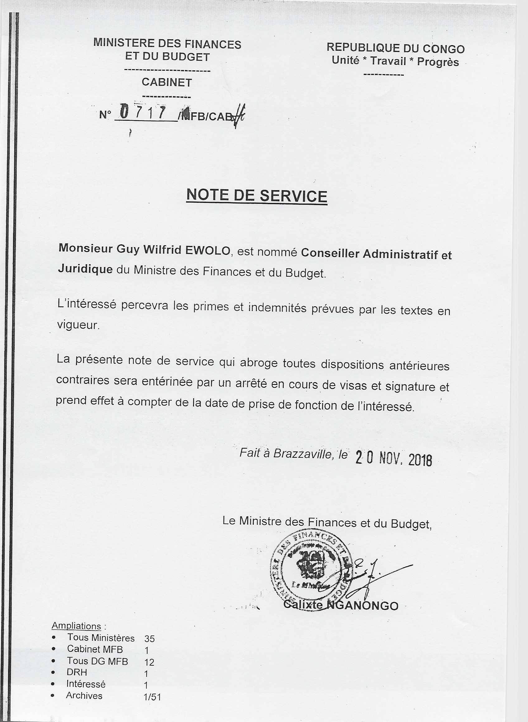 > Note de service n°0717/MFB-CAB relative à la nomination du Conseiller administratif et juridique