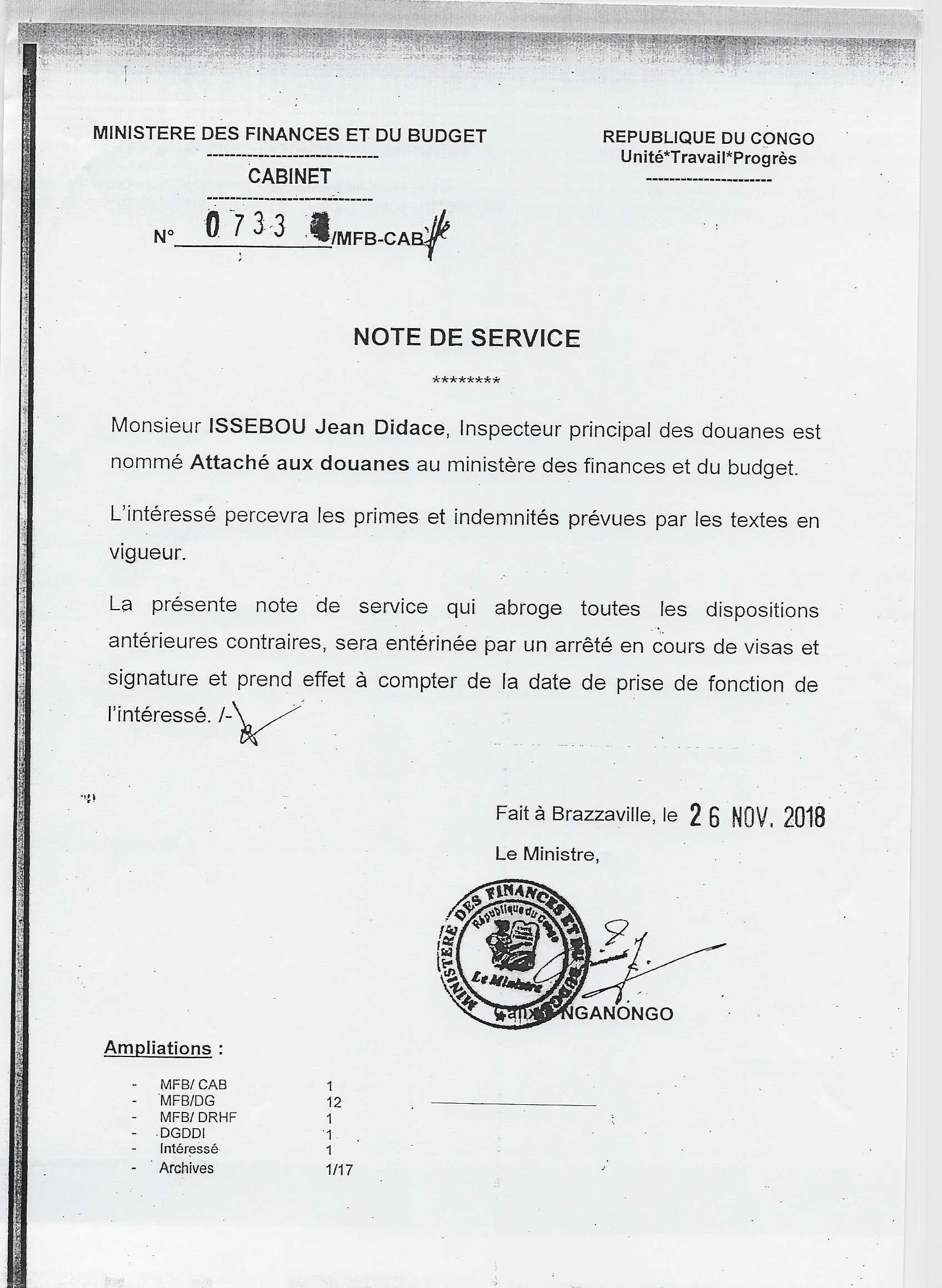 > Note de service n°0733/MFB-CAB relative à la nomination de l'Attaché aux douanes