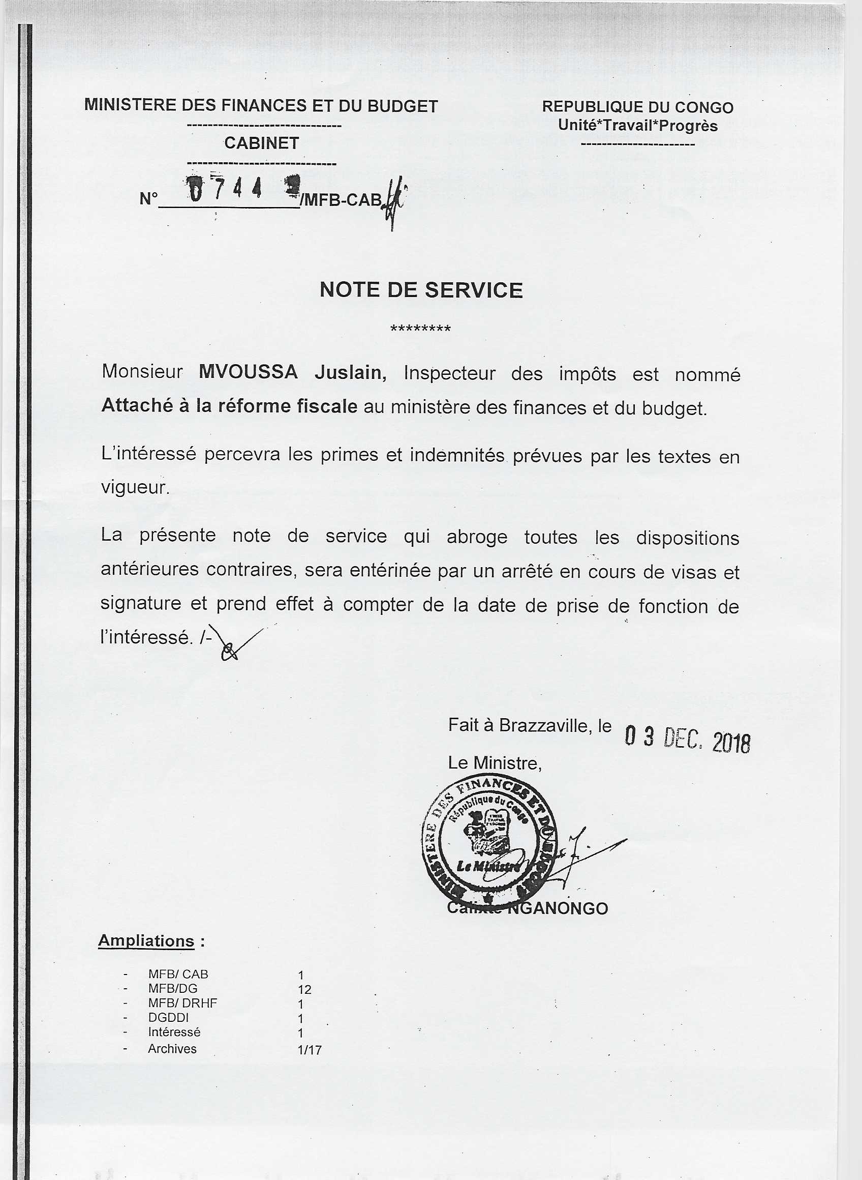 Note de service n°0744/MFB-CAB relative à la nomination de l'Attaché à la réforme fiscale